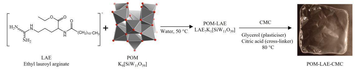 Widespread use of plastics poses a serious environmental hazard to our planet and should be substituted by eco-friendly and biodegradable alternatives, simultaneously reducing waste of perishable food products and the risk of transmission of pathogenic microbes. In our study, we describe how the water solubility of the antimicrobial surfactant ethyl lauroyl arginate (LAE) can be reduced through complexation with a Keggin-type polyoxometalate (POM), K8[SiW11O39]. The POM-LAE complex, LAE7K[SiW11O39], was effective against Listeria monocytogenes (L. monocytogenes) and Escherichia coli (E. coli) with minimal inhibitory concentrations (MICs) of 32 and 64 μg/mL, respectively, with the important finding that the concentrations of LAE required to inhibit bacterial growth were as much as two times lower in the POM-LAE complex, compared with LAE on its own. In addition, our results demonstrate that POM-LAE is both an effective inhibitor of biofilm formation and is also able to destroy pre-formed biofilms of L. monocytogenes and E. coli at MIC concentrations. Further, POM-LAE was incorporated into carboxymethyl cellulose (CMC) films that were able to reduce 7–8 log (CFU/mL) of L. monocytogenes at concentrations of 5–10% POM-LAE. In vivo assays of the POM-LAE-CMC films with cured ham prevented initialk bacterial growth with a 0.77 log significative reduction in bacterial counts. Overall, this work provides new alternatives for the development of antimicrobial biodegradable films for ready-to-eat (RTE) foods prone to contamination with pathogenic bacteria, such as L. monocytogenes, while also circumventing practical issues related to the incorporation of LAE into active packaging films.